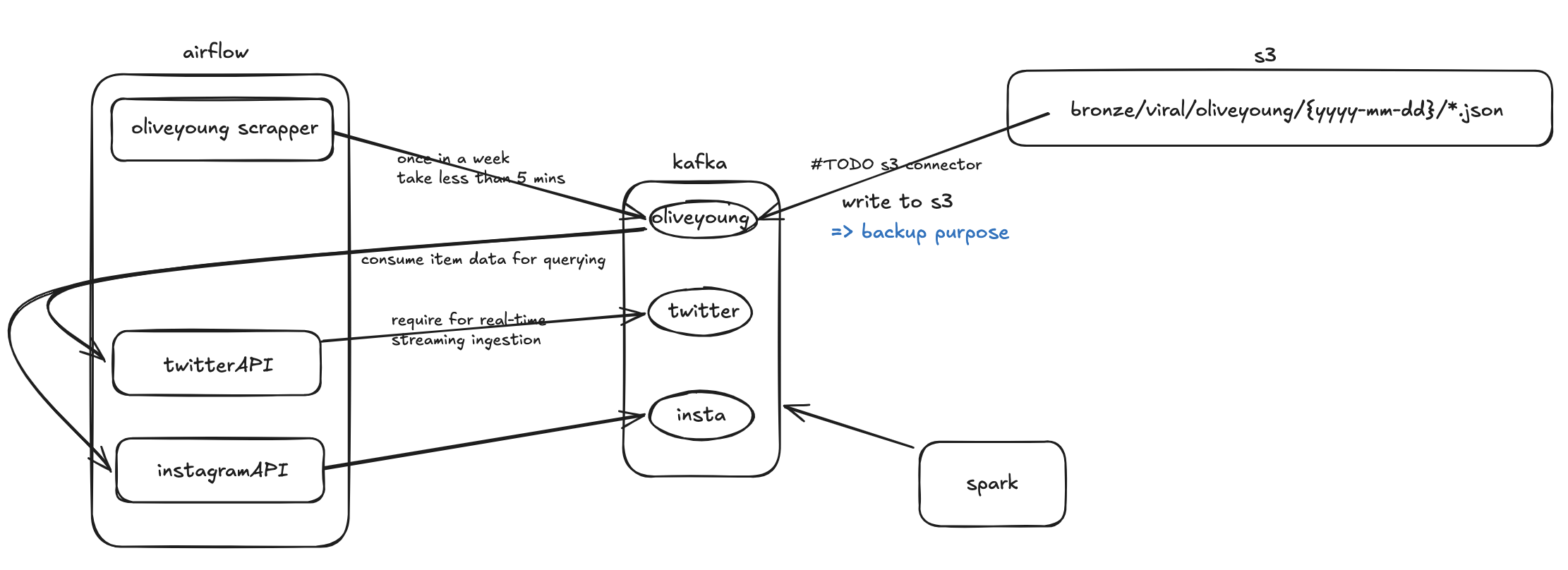 이후 instagram, twitter등 다양한 소스로부터 데이터를 수집해야 하는데요. kafka connect 를 초반에 한번 구축해두면 kafka가 중간 브릿지로 유용하게 역할을 할 수 있습니다. 수집 데이터를 토픽에 쏘기만 하면 airflow task 개발 공수 없이 kafka connect task 만 새로 선언해서 자동으로 s3에 적재되도록 할 수 있습니다.