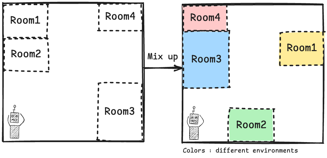 보통은 mix up room from different environment, change appearance and style of the environment, interpolate high-frequency features with the environments 방법들을 주로 사용합니다.