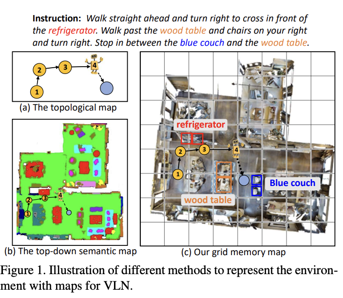 다른 연구 흐름으로 Graph information을 가지고 navigation history를 modeling하는 흐름이 있습니다. 예를 들어서 몇 작업들은 구조화된 transformer encoder를 활용해서 geometric cues를 캡처하는 것이 있고, 추가적으로 많은 작업들이 topological graph에 더하여, grid map, semantic map, local metrics map, local neighborhood map과 같은 top-down view information을 이용하는 것을 제안하기도 했습니다. (Grid Map을 예로 들면 에이전트가 수집한 history information을 해당 gird cell에 encoding 하는 방식)