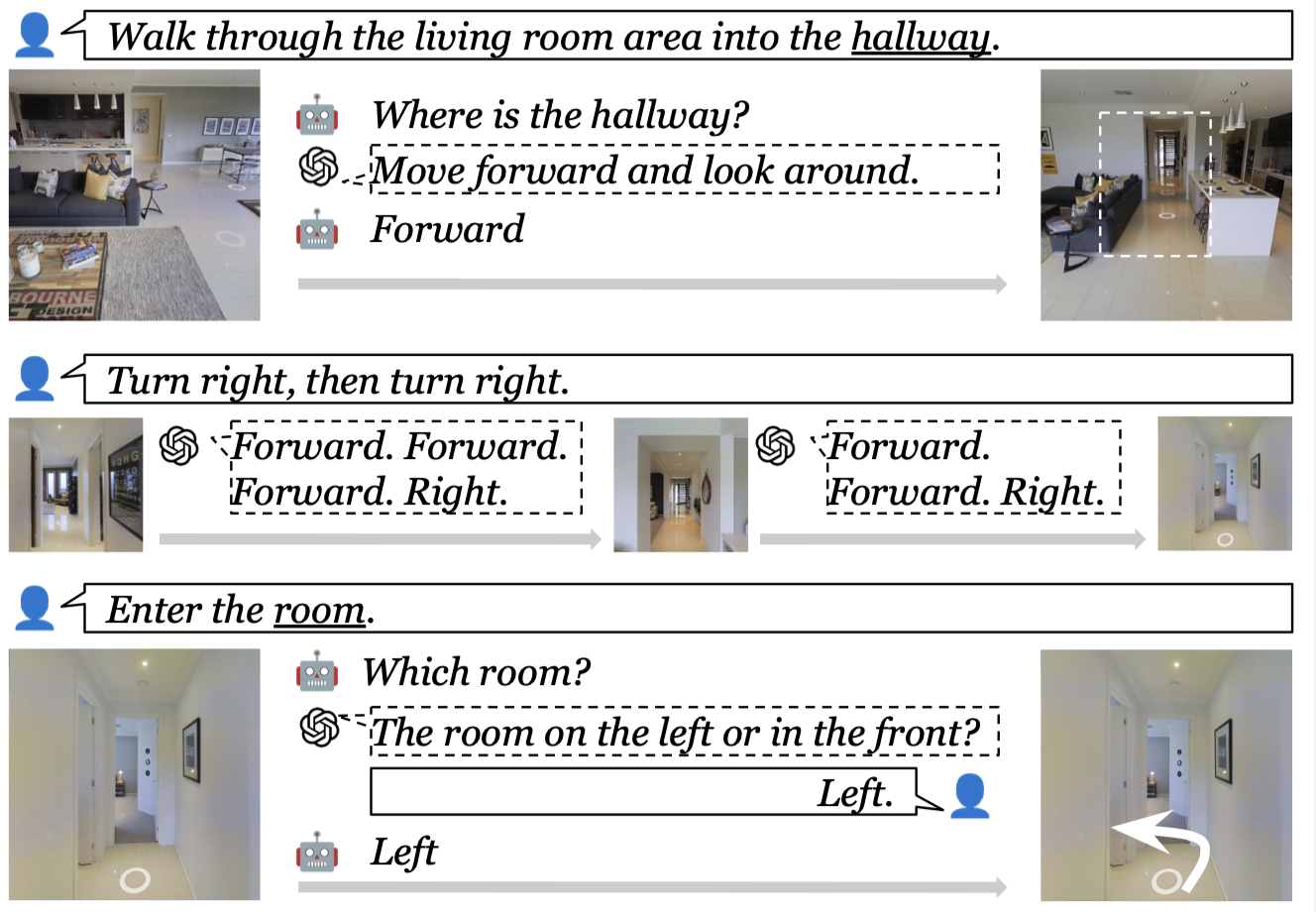 VLN에서 agent는 World model에서 살펴봤던 내용처럼 실제 물리 세계를 학습하고 모델링하는 것도 중요하지만, 각각의 상황마다 navigation task를 완수하기 위해서 주어지는 instruction을 이해하는 것 역시 매우 중요한 부분입니다.