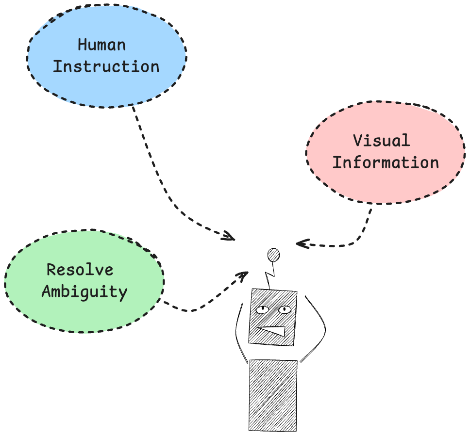 위에서 설명한 방식들은 모두 애매한 지시문에 대해서 visual perception과 situational context를 활용해서 해석하려고 한다면, 사실 애매한 지시문을 해결하기 위한 매우 직관적인 방법이 있습니다.