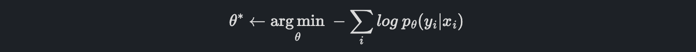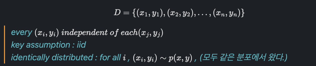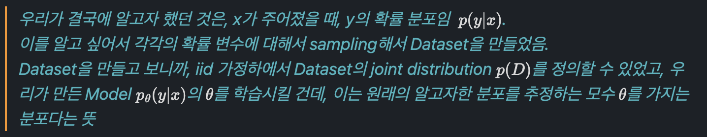 우리가 생각하는 모델은 결국 x가 주어졌을 때 y를 출력하는 "어떤 함수"라고 생각할 수 있고, 이 함수를 x가 주어졌을 때, y에 대한 조건부 확률 분포라고 생각할 수 있습니다.