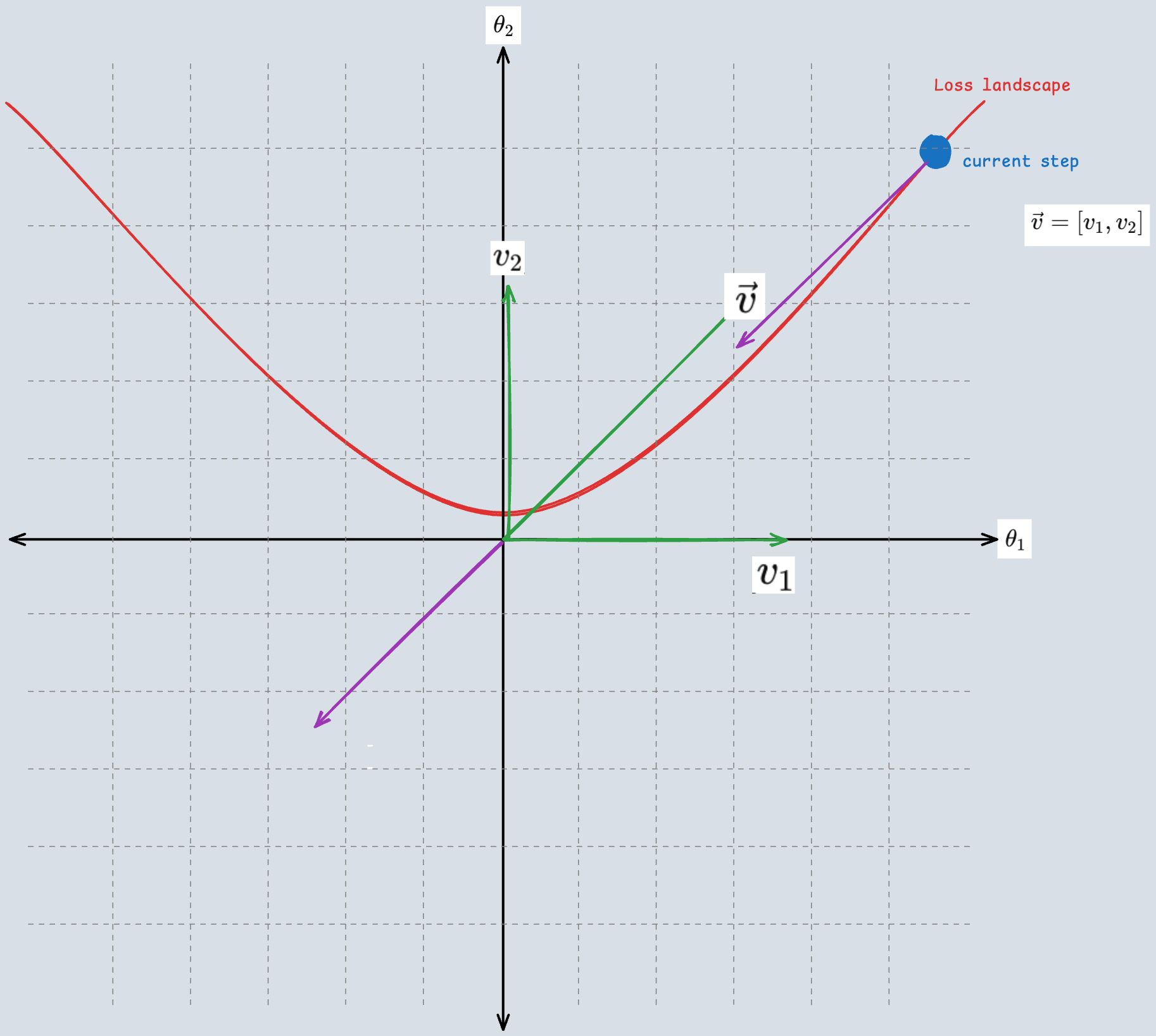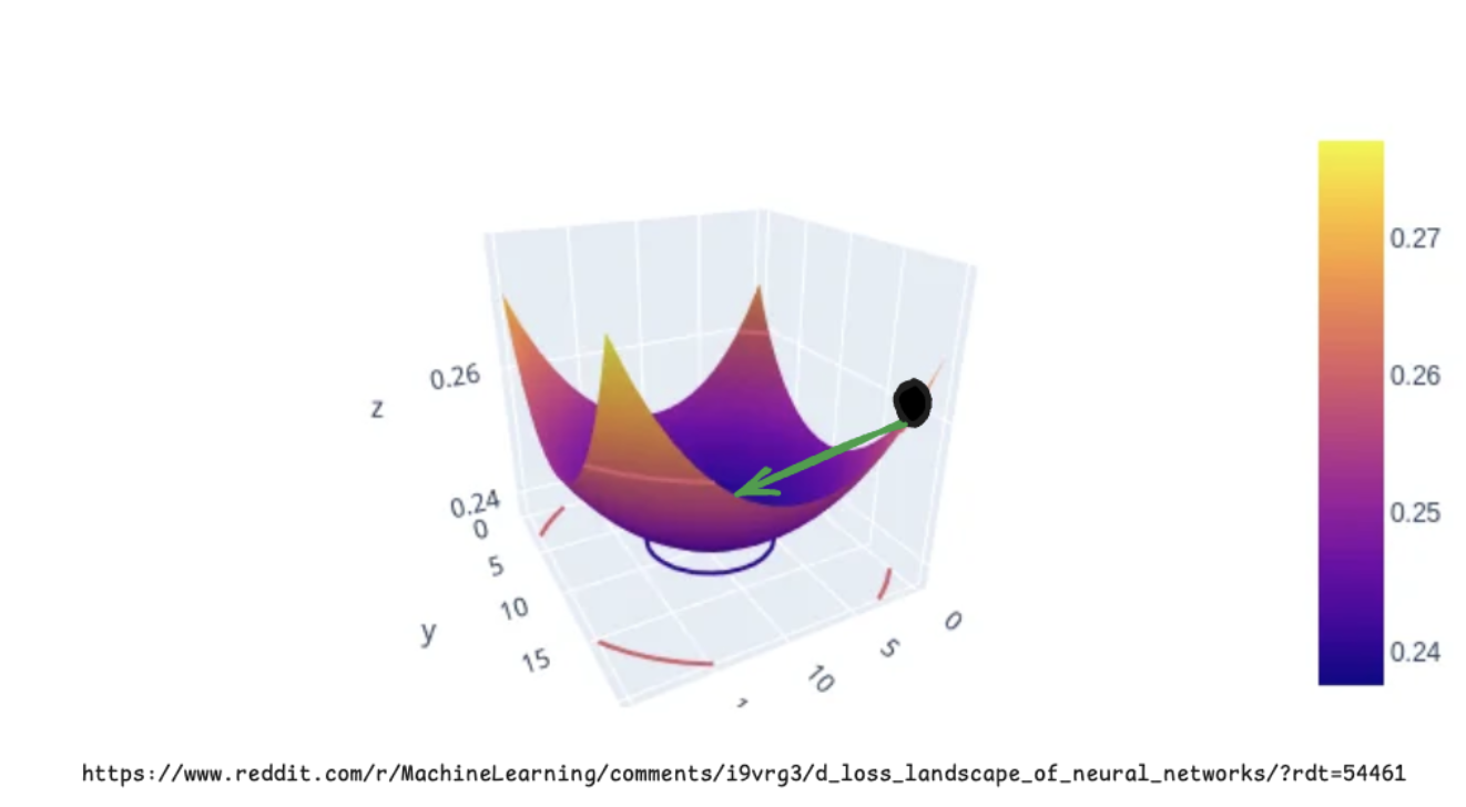 참 분포와 가까워지려면 loss가 최소인 상태로 가야 합니다. 이를 loss landscape 상에서 표현하면 위와 같이 표현할 수 있고, 검은색 포인트에서 화살표 방향으로 가야 하는 것입니다. (화살표 방향으로 가는 과정이 우리가 이야기하는 training)