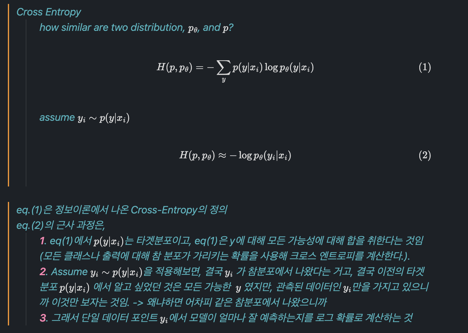 자 처음에 우리가 학습 파라미터를 가진 확률분포를 학습시킬 건데, 이는 결국에 True p(y|x)의 model이 되는 것입니다.