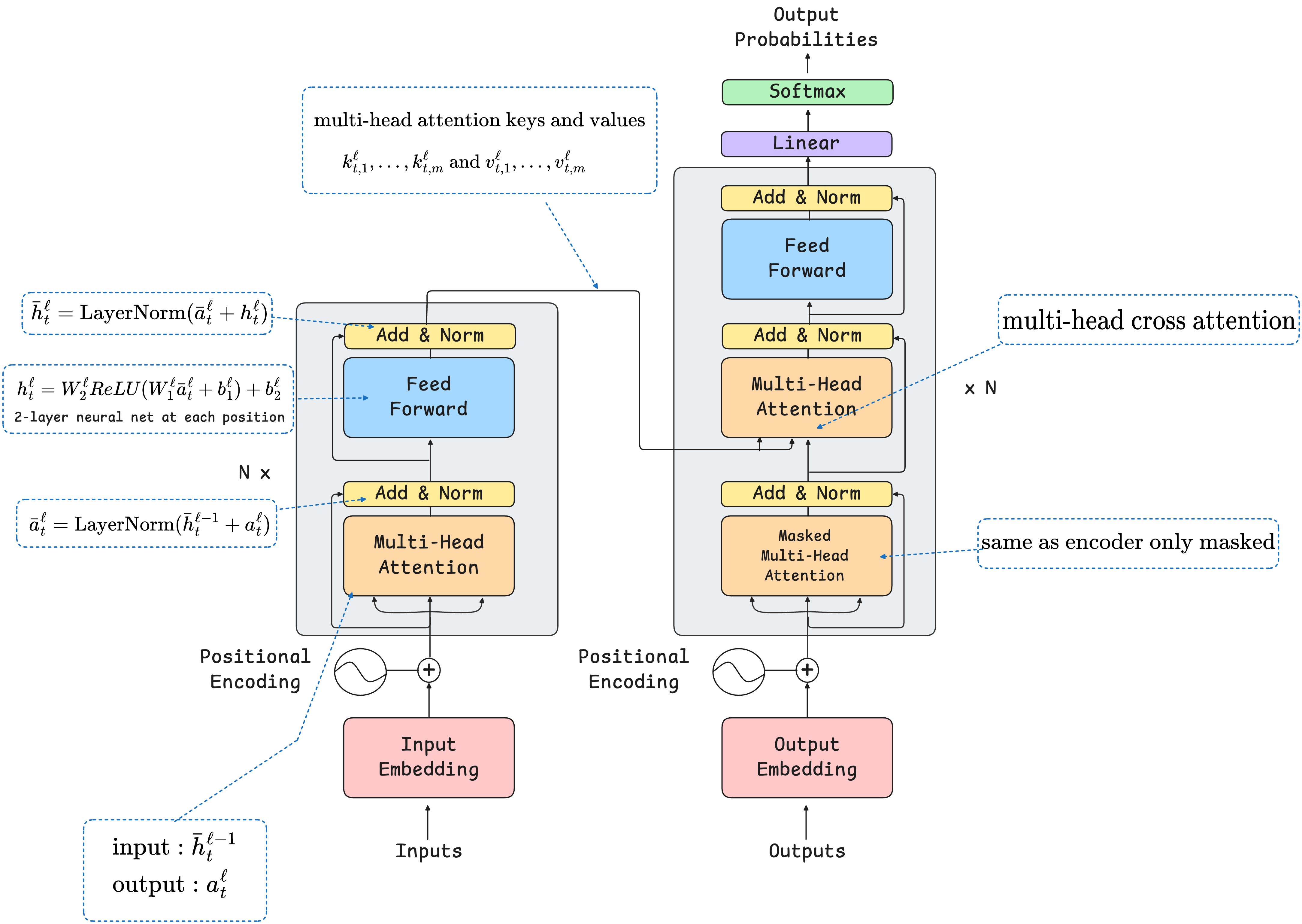 cross-attention은 단순합니다. 우리가 처음 seq2seq model에서의 attention 개념과 일치하는데, encoder의 key, value, decoder의 query 그리고 서로 attention 한다는 의미에서 "cross"가 붙었습니다.