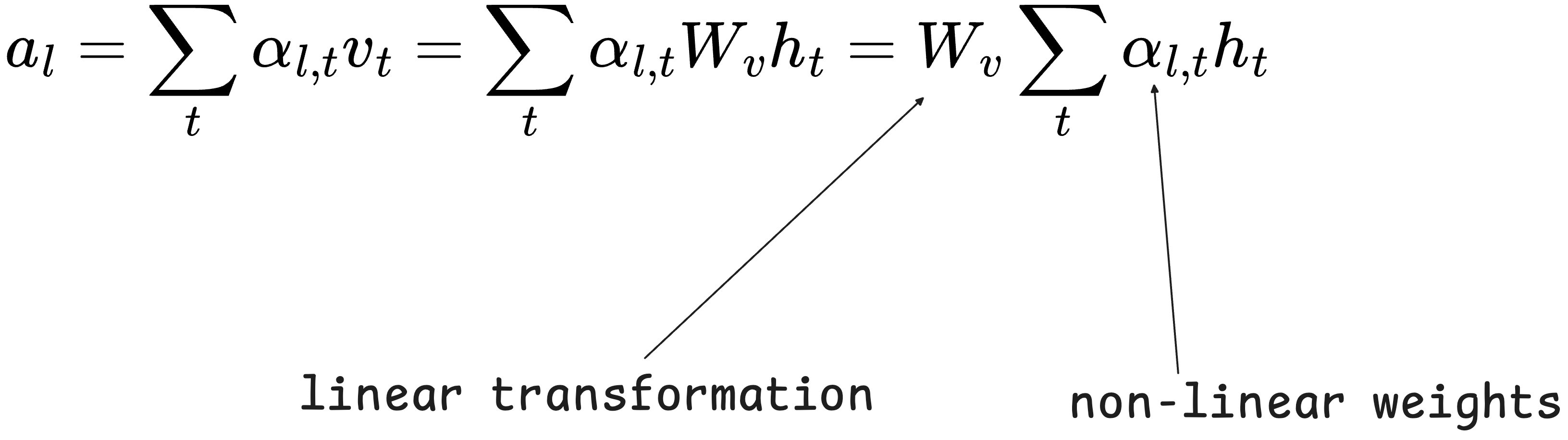 self-attention만 보면 완전 linear 합니다. linear operation 밖에 없다는 의미인데, 수식을 다시 살펴봅시다. 간단한 버전으로 다시 살펴보면,