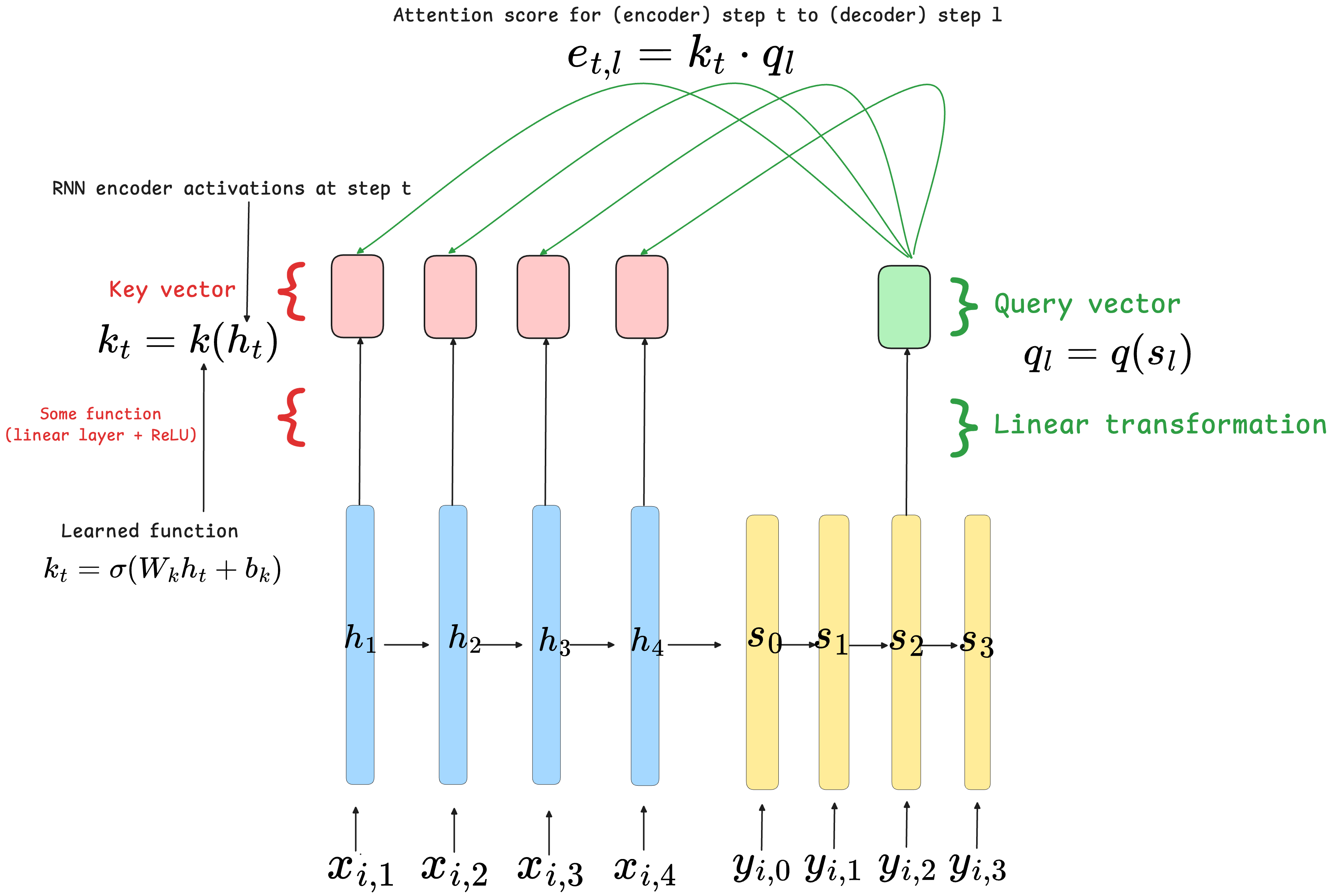 의미적으로는 각 decoder step에서의 필요한 정보를 encoder에 있는 정보에서 참고하기 위해서 encoder의 어떤 정보가 가장 현재 step에서 중요한 정보일까?를 보는 과정이라고 생각할 수 있습니다. 이제는 한 번 수식으로 살펴보도록 하겠습니다.