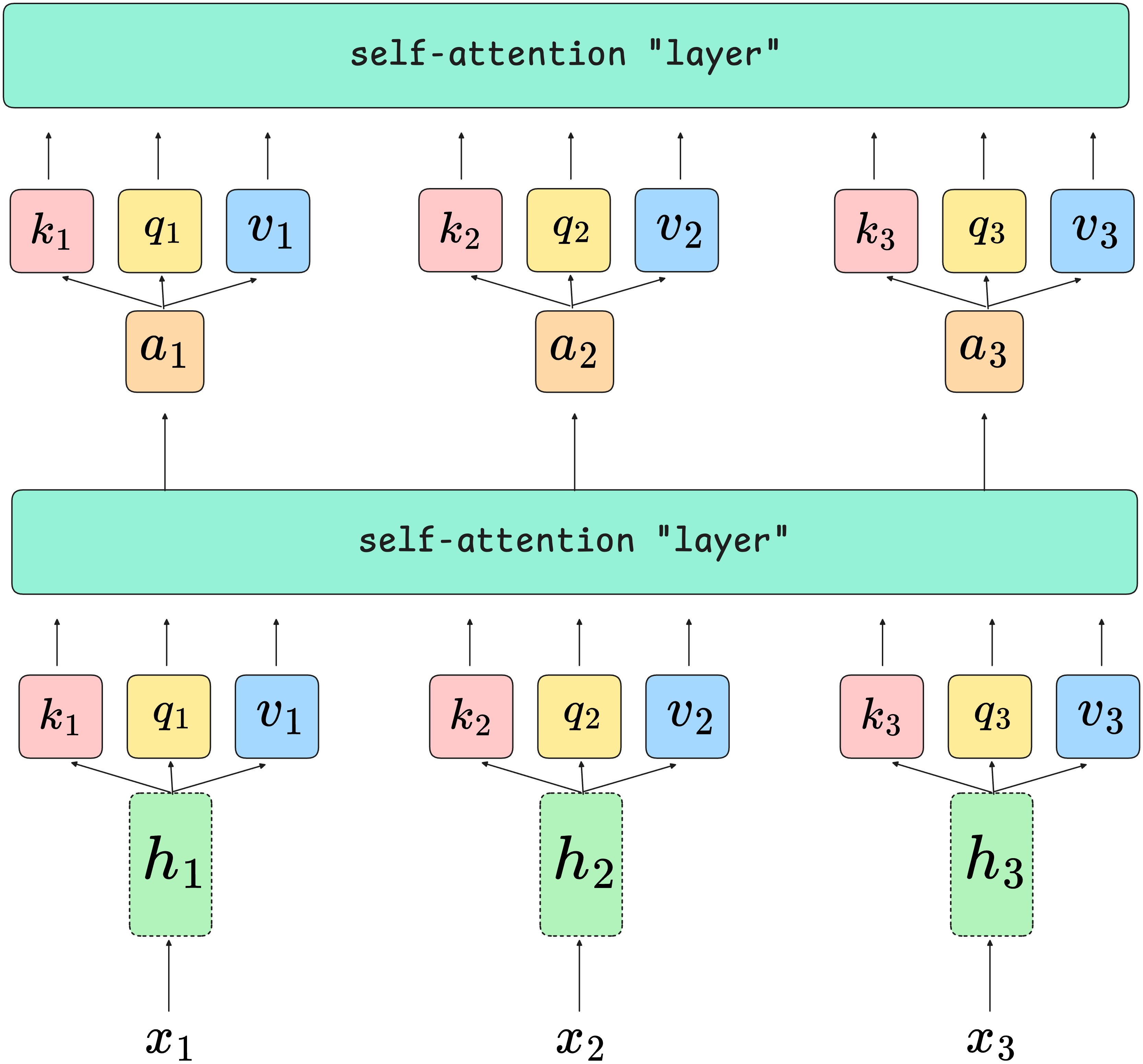 뭔가 복잡해 보이지만, 이전에 다루었던, attention과 큰 차이는 없습니다. 차이라고 하면 value 값인 v가 추가된 것과 각 step에서 스스로 attention을 적용한다는 점입니다. 그래서 이러한 방법을 self-attention이라고 합니다.