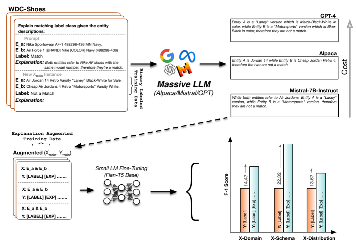 프로덕트 매칭 문제는 일반적으로 이진 분류 문제로 접근하여 두 페어가 일치하는지 판별합니다. 하지만 모든 페어를 비교하는 것은 많은 계산 비용을 요구하므로 효율적인 방법이 필요합니다. 또한 한 도메인에서 훈련된 모델은 다른 도메인에서 잘 작동하지 않는 경우가 많습니다. 이를 해결하기 위해 LLM을 작은 모델로 Distillation 하는 방안이 연구되고 있습니다. 최근 한 연구에서는 LLM이 활용해 생성 모델에서 Chain of Thought 방식의 추론을 가능하게 하는 방식으로 LLM의 추론 능력을 전이하여 일반화 성능과 Out-of-Domain 성능을 향상 시킬 수 있다고 제시했습니다.