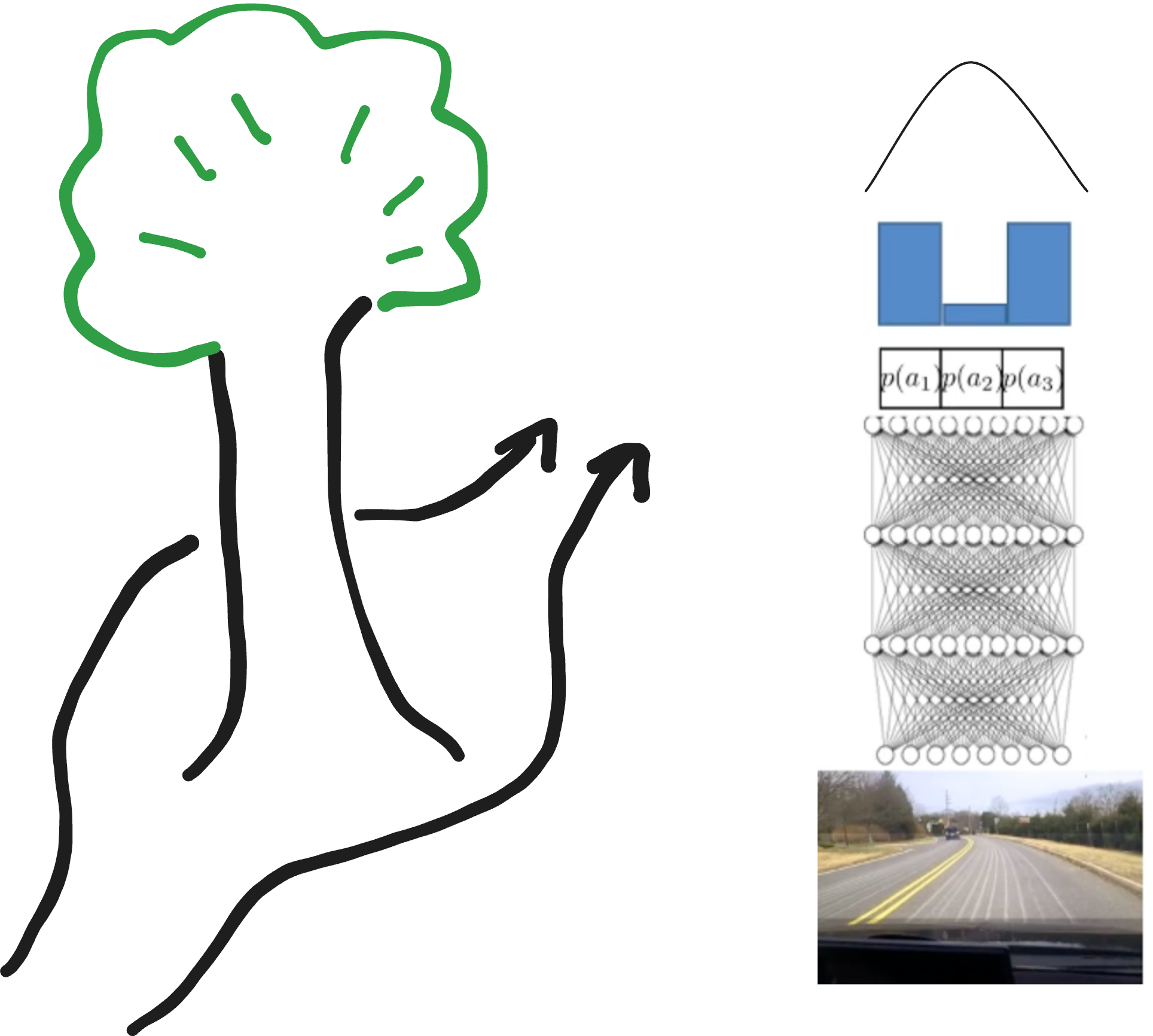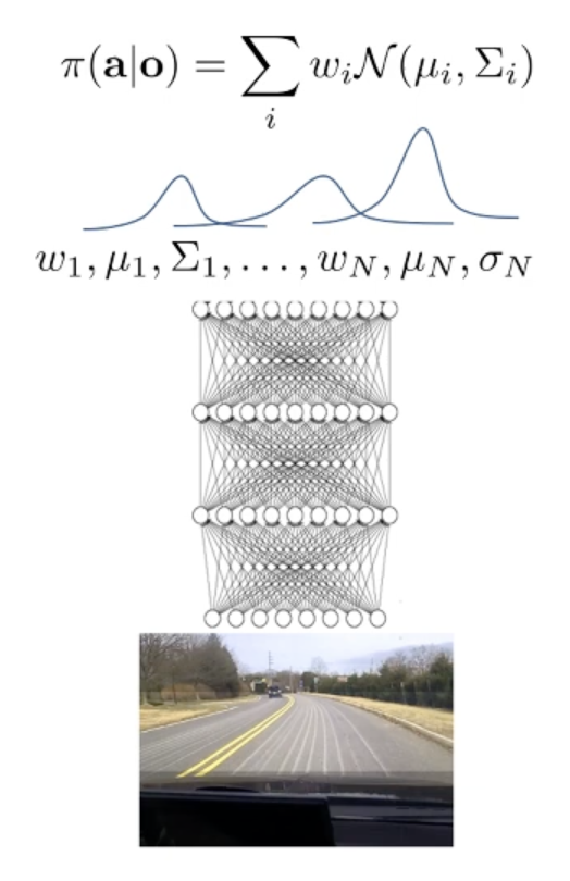 다음과 같은 상황 : 왼쪽으로 가도 괜찮고, 오른쪽으로 가도 괜찮은 상황에서 MSE Loss를 가지고 prediction을 수행한다면, 결국 평균을 취하기 때문에, 가운데로 간다는 것입니다. 이를 해결하기 위해서 여러 개의 gaussian output을 mix하거나, latent variable models, Autoregressive discretization을 사용합니다.