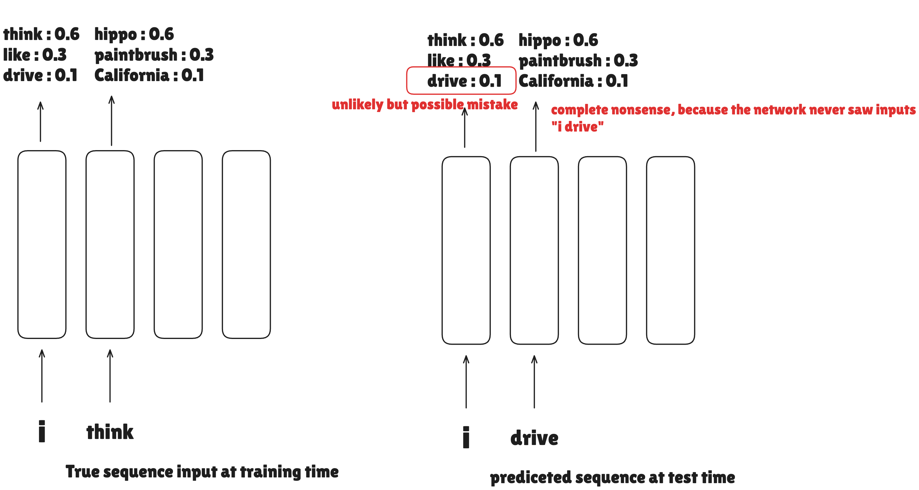해당 문제는 이전의 recurrent neural network에서도 비슷한 맥락이 있었습니다. distributional shift라는 문제입니다. 이는 RNN의 decoding 과정에서 training 시에는 항상 true sequence를 입력으로 받지만, test 시에는 예측값을 입력으로 받기 때문에 생기는 오차를 이야기합니다.