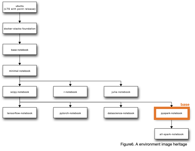 해당 베이스 이미지는 ubuntu에 python, conda, jupyter, scipy package, spark 순서 레이어로 구성됩니다. (도커 이미지 계층구조 figure6 참고)