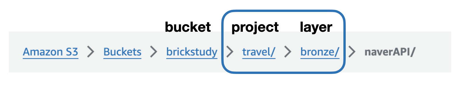 현재 저희의 main destination stoarge로 S3를 사용하고 있습니다. S3 내에 아래 이미지와 같이 공용 버킷 안에 각 프로젝트의 Data Lakehouse가 존재하고, 각 프로젝트의 DL에 메달리온 아키텍처를 적용하고 있습니다.