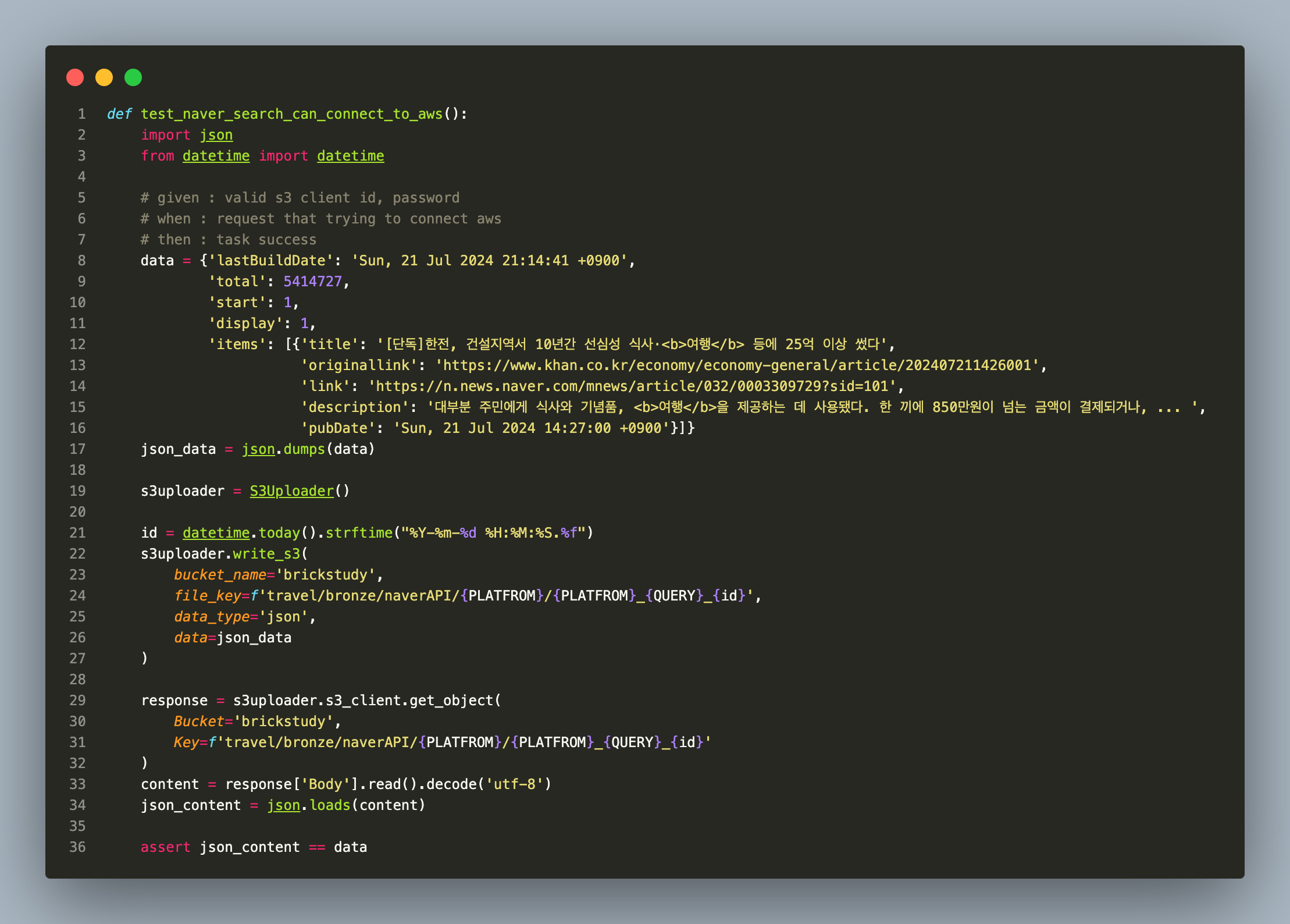 현재 검색 키워드 및 검색 대상 플랫폼을 쿼리 인자로 naverAPI를 통해 데이터를 수집하는 모듈, AWS sdk를 통해 S3에 데이터를 적재하는 모듈을 개발했습니다. 해당 모듈을 통해 데이터를 수집 및 적재하는 airflow task가 스케줄링됩니다.
