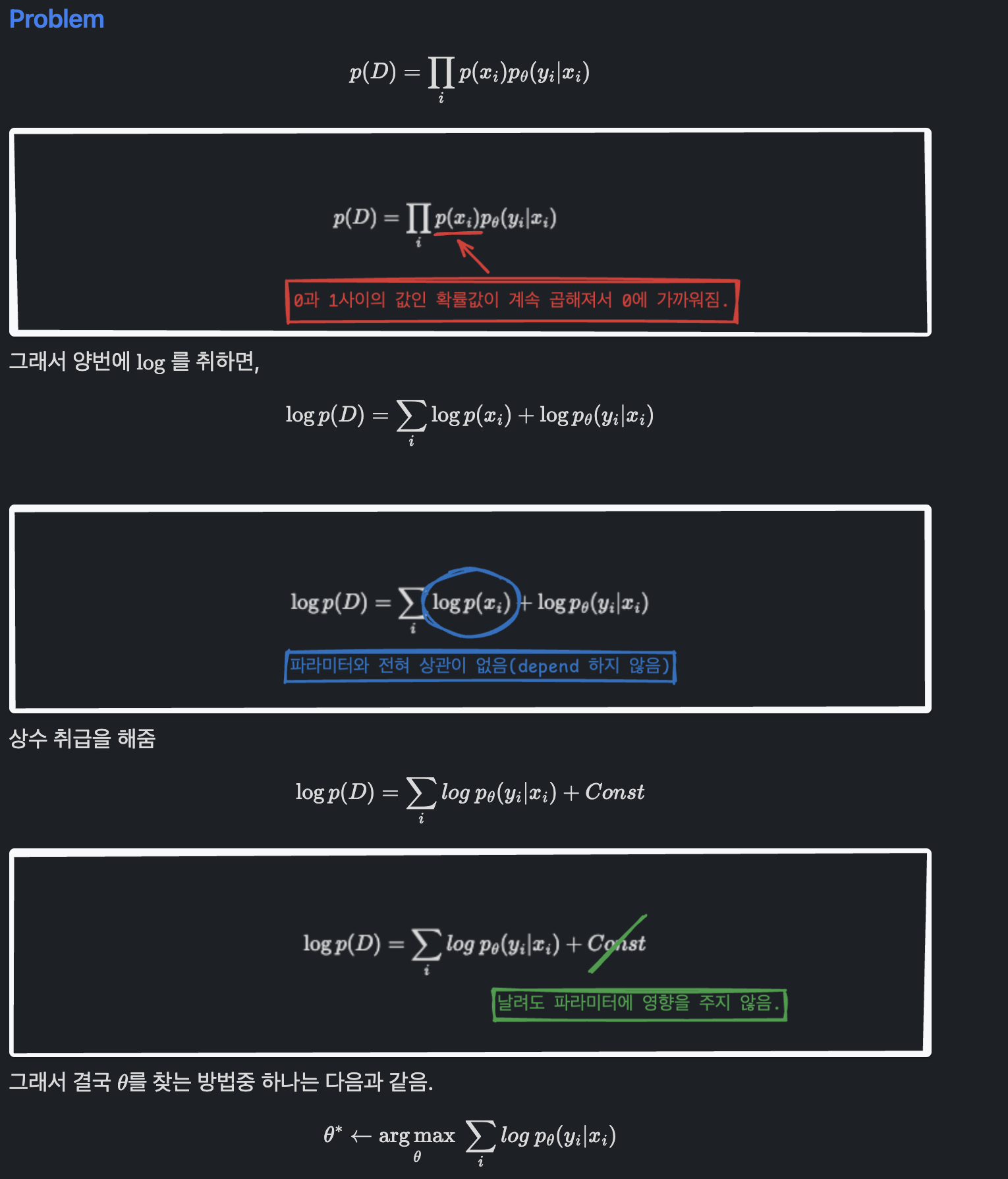 우리가 생각하는 모델은 결국 x가 주어졌을 때 y를 출력하는 "어떤 함수"라고 생각할 수 있고, 이 함수를 x가 주어졌을 때, y에 대한 조건부 확률 분포라고 생각할 수 있습니다.