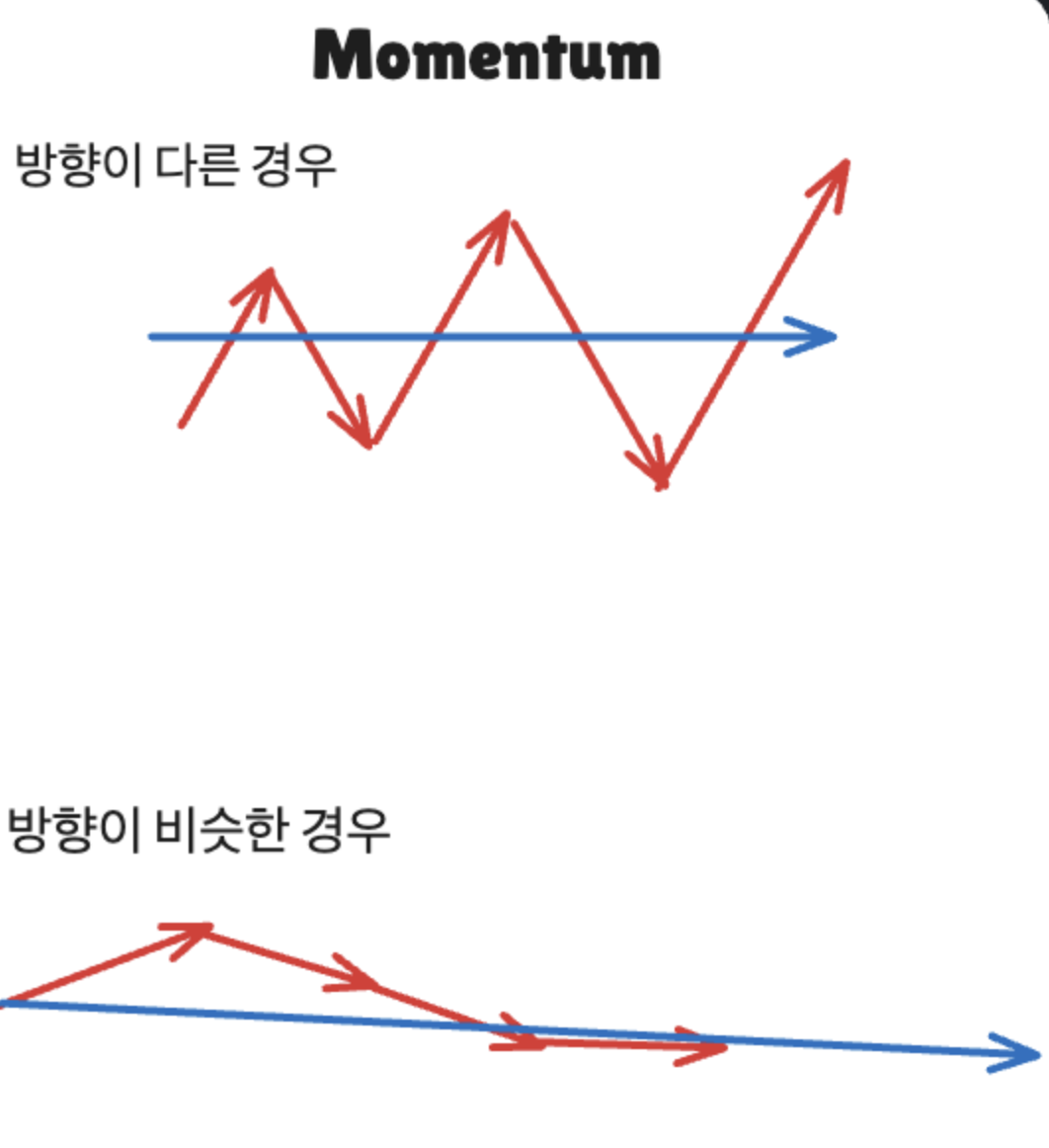 첫 번째로 살펴볼 방식은 모멘텀입니다. 모멘텀의 경우에는 직관적으로는 여러 번 갈 거 한 번에 가자는 느낌인데요