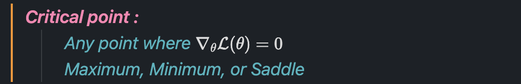 여기서 Hessian matrix의 diagonal entries들이 모두 양수이면, 해당 지점은 minimum이고, 모두 음수이면, 해당 지점은 maximum에 해당하는데, 고차원에서는 entries가 매우 많기 때문에, 대각 원소들이 모두 같은 부호일 확률이 매우 낮습니다. 결과적으로 양수와 음수가 섞이기 쉽고, 이는 minimum이나, maximum이 아니라 saddle point가 됩니다. 따라서 대부분의 고차원 neural network의 critical point는 saddle point입니다.