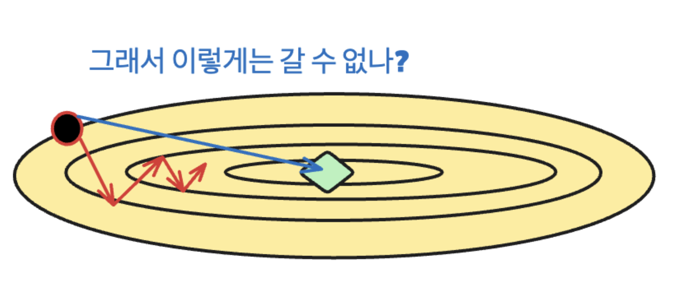 빨간색 점인, start point에서 초록색 점 optimum으로 가야 할 때, 최적의 동선은 주황색 화살표가 될 것입니다. 그러나, steepest direction을 취하게 되면 빨간색 화살표처럼 돌아가는 길을 선택하게 됩니다.