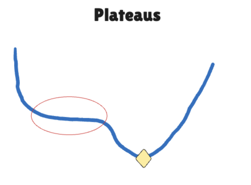 학습을 하다 보면, 저렇게 평탄한 구간에 갇힐 수가 있습니다. 평탄한 구간이라서 gradient값이 매우 작기 때문에 쉽게 빠져나가지 못하는 것도 있습니다. 그래서 평탄한 구간에서는 learning rate 값이 충분히 커야 빠르게 진행될 수가 있습니다.